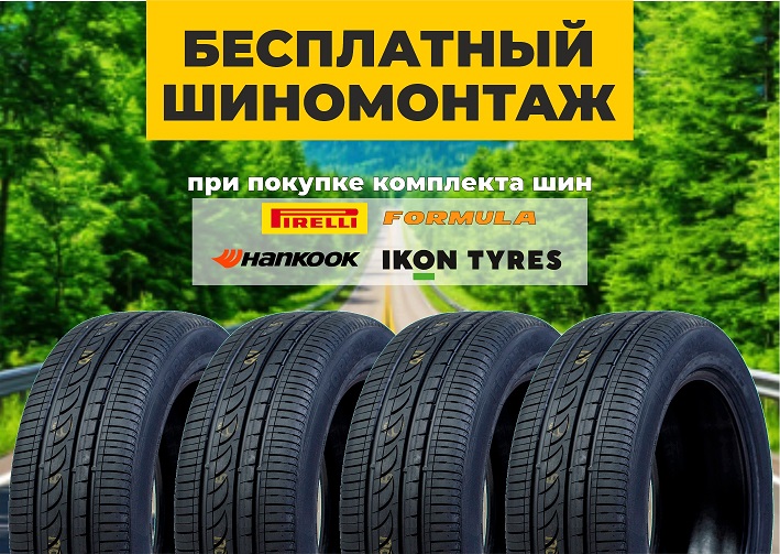 При покупке 4 легковых летних шин брендов Pirelli, Formula, Hankook, Ikon. Шиномонтаж в подарок!