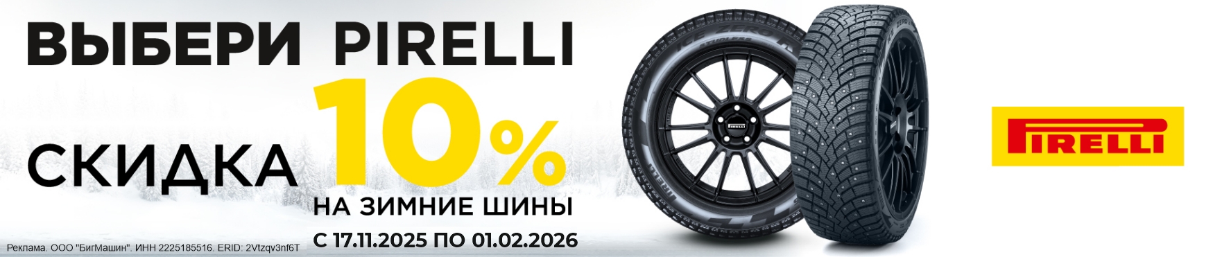 С 17 ноября по 01 февраля 2026 года выберите зимние шины Pirelli и получите скидку 10%. Ассортимент ограничен.
